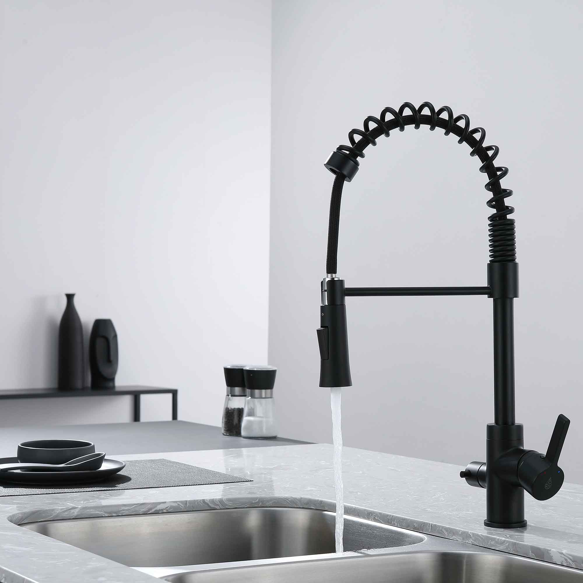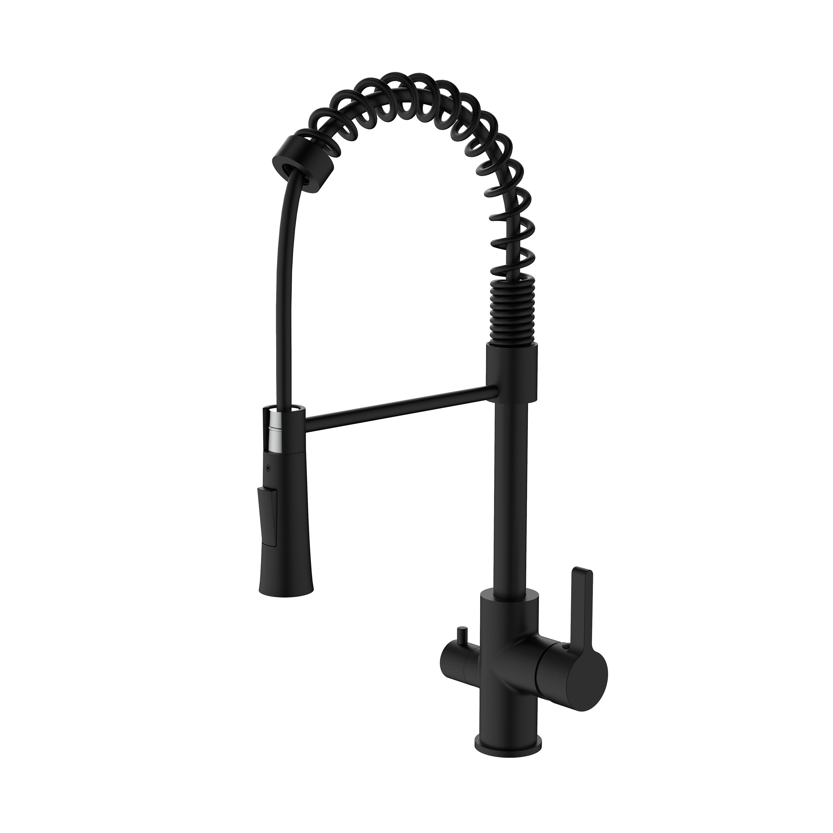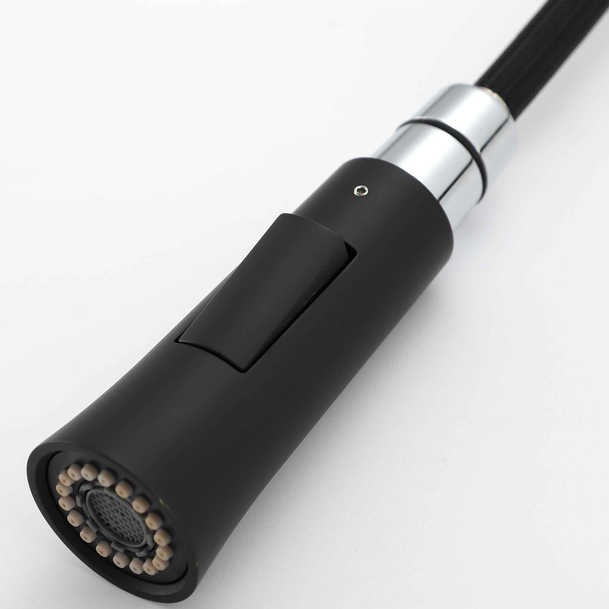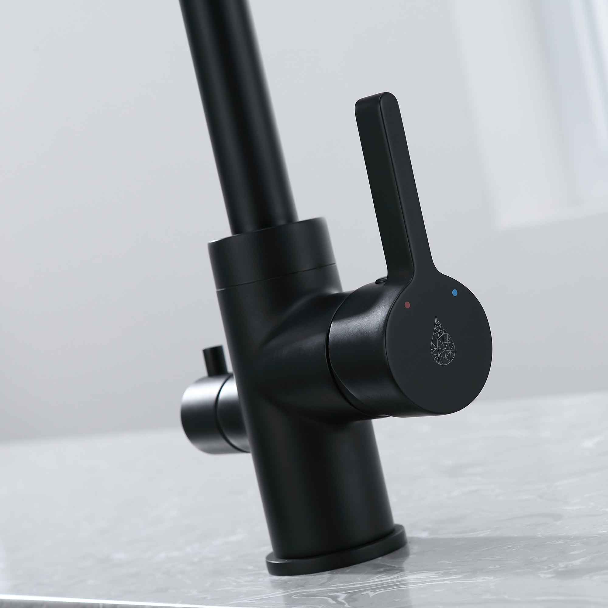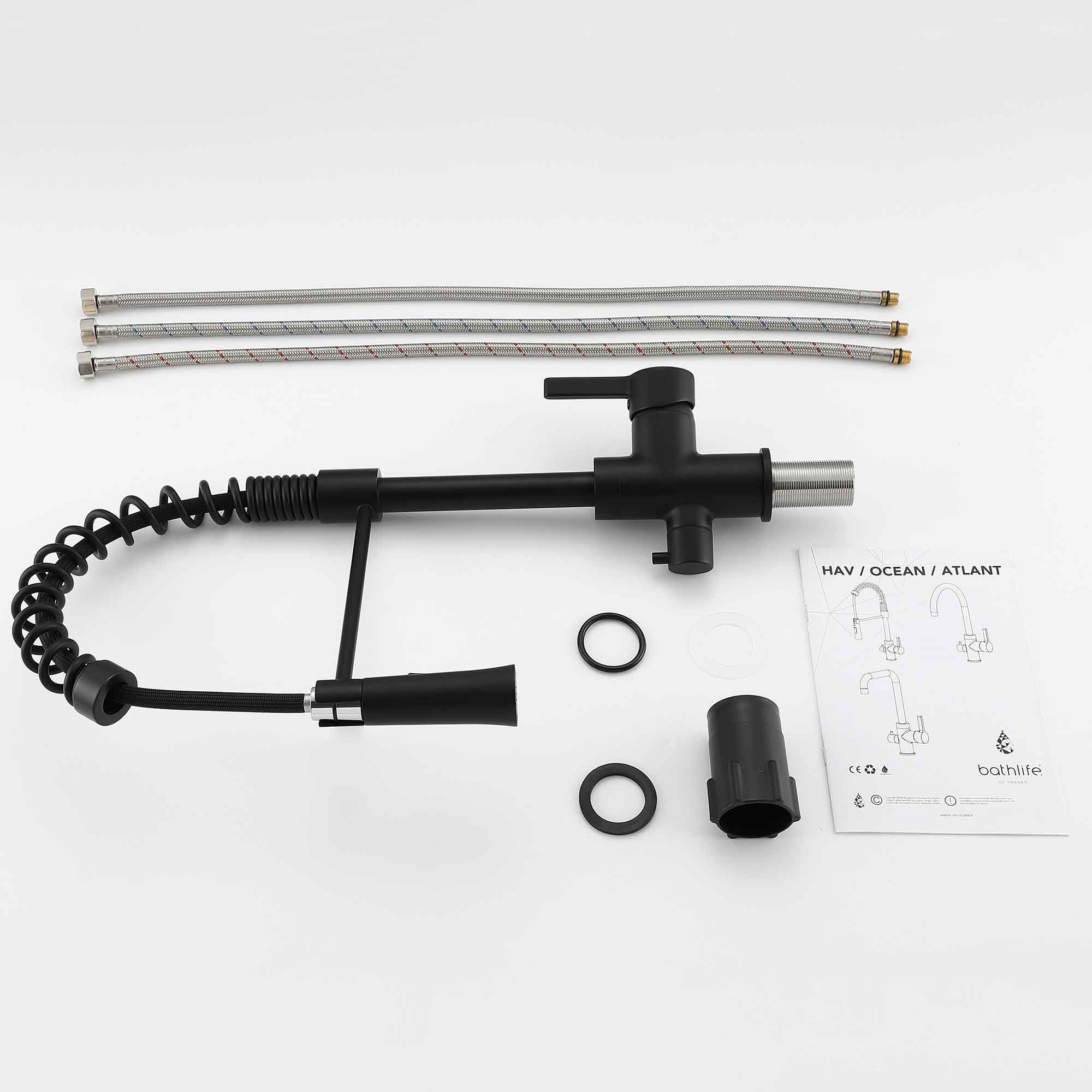Musta, teollishenkinen keittiöhana Bathlife Hav sisältää astianpesukoneventtiilin ja ulosvedettävän juoksuputken. Juoksuputki helpottaa niin altaan kuin astioidenkin puhtaanapitoa. Tyylikäs hana päivittää keittiön tälle vuosikymmenelle kertaheitolla. Hana on helppo puhdistaa kostealla liinalla ja pienellä määrällä saippuaa.