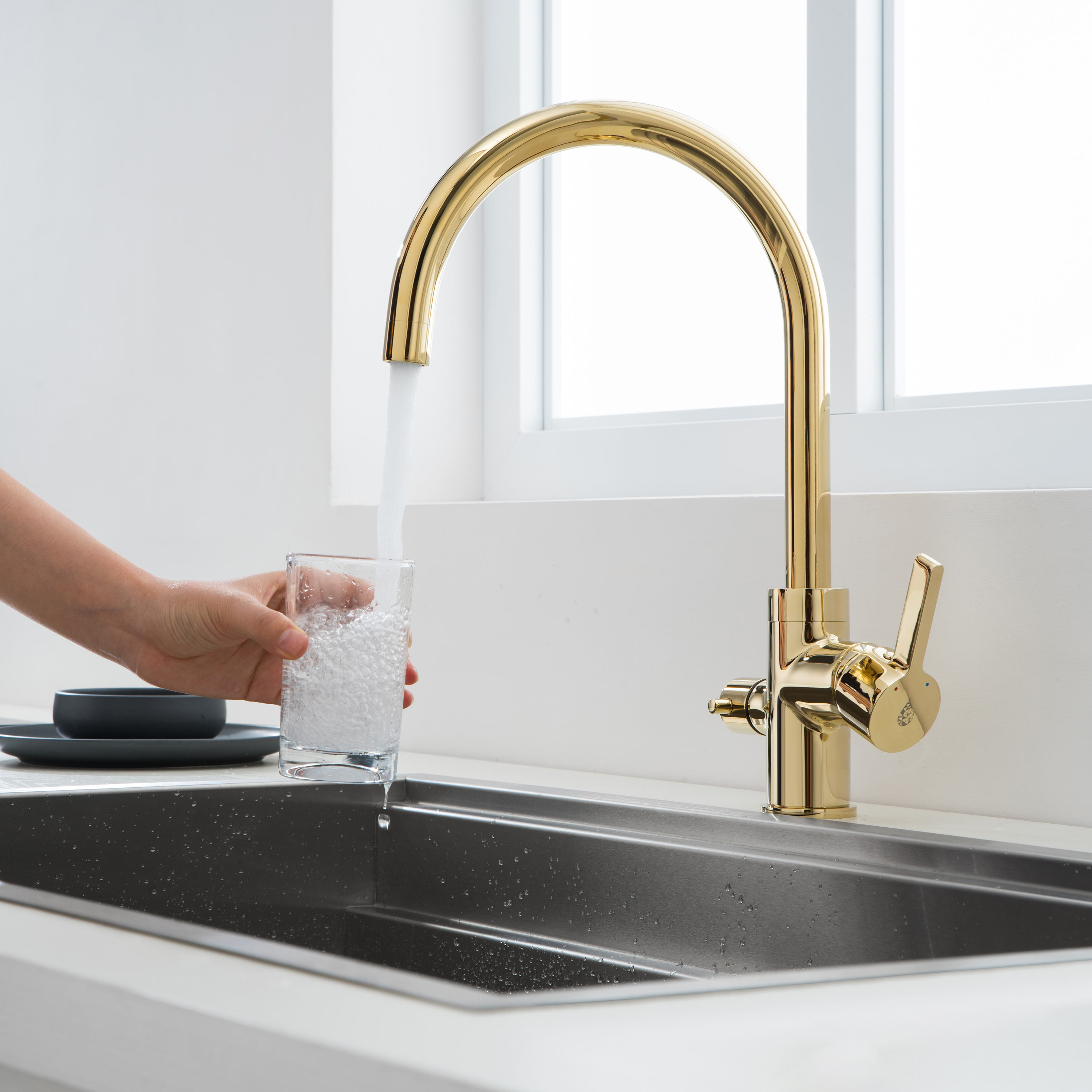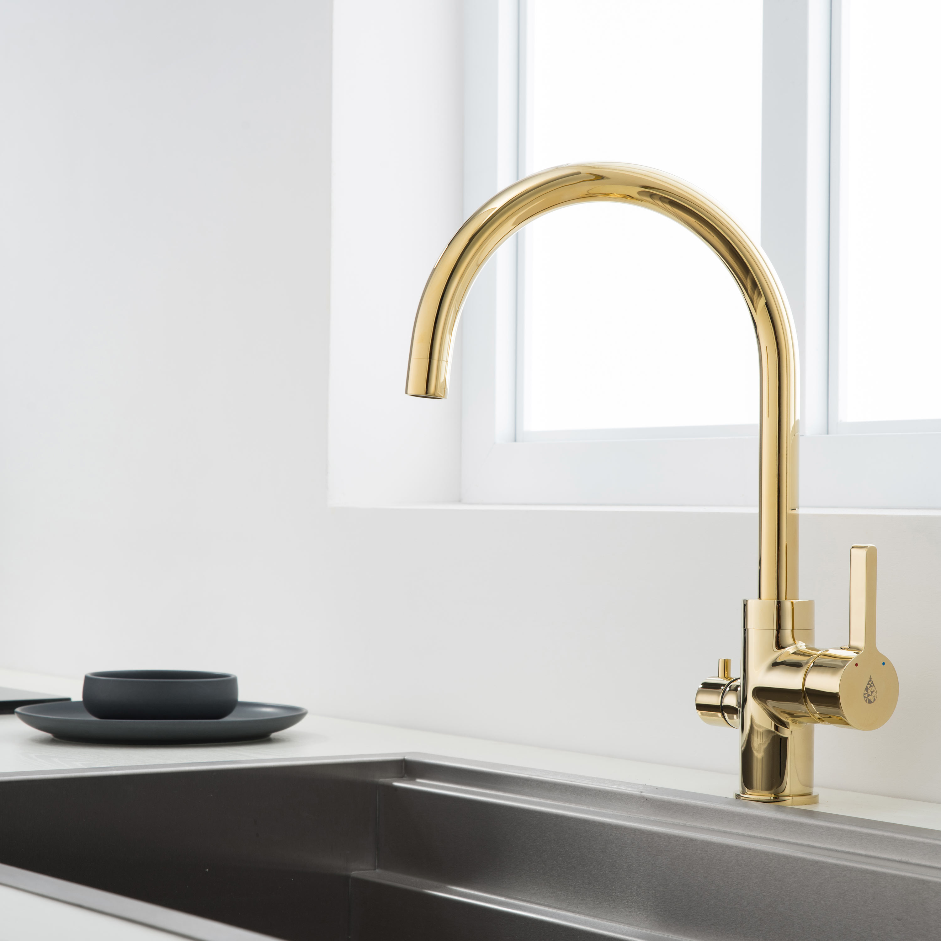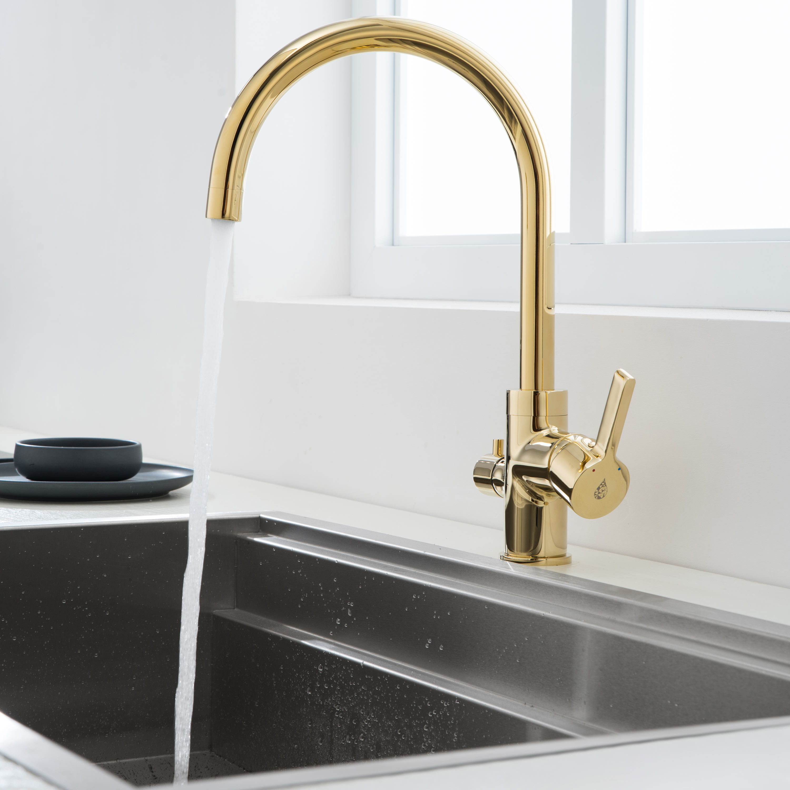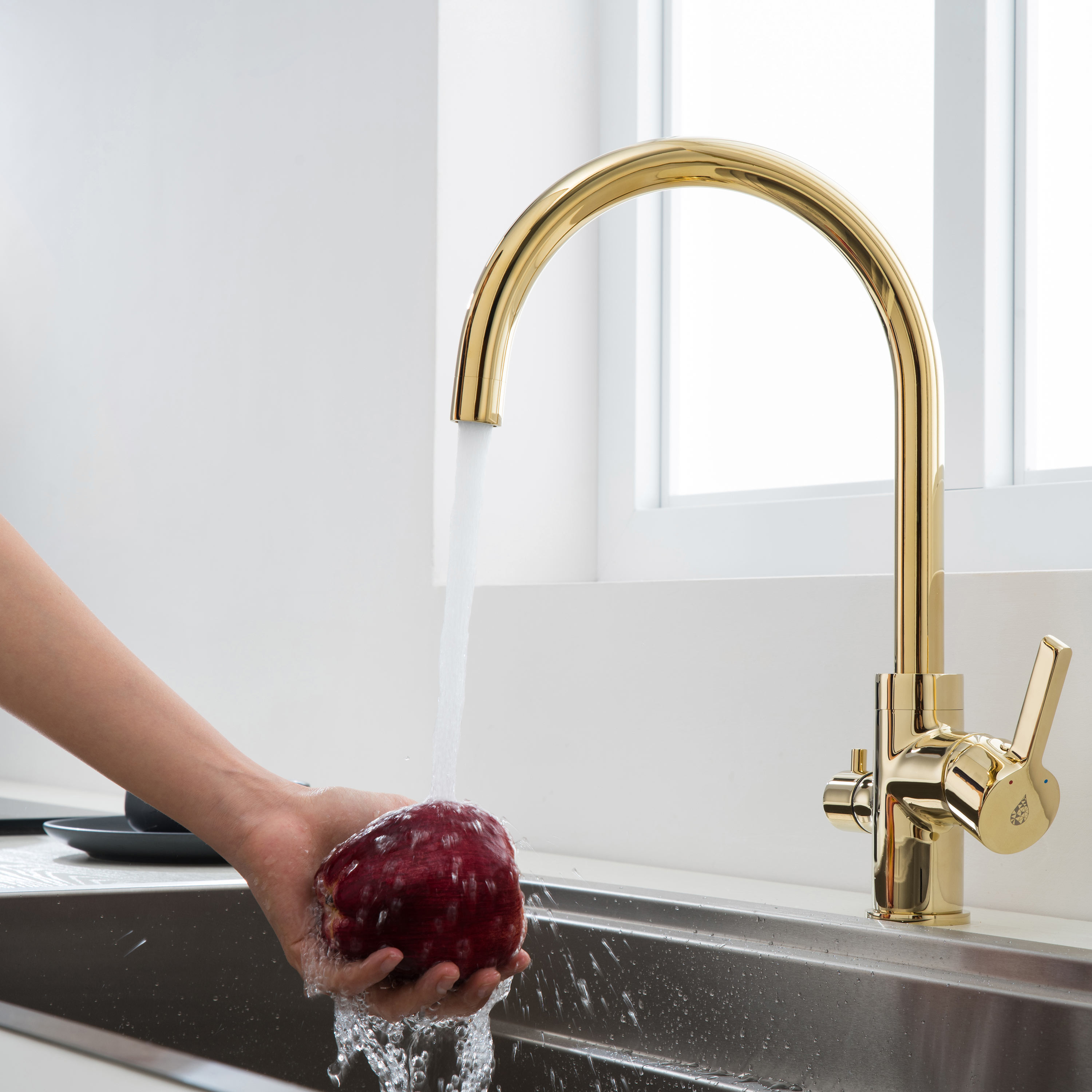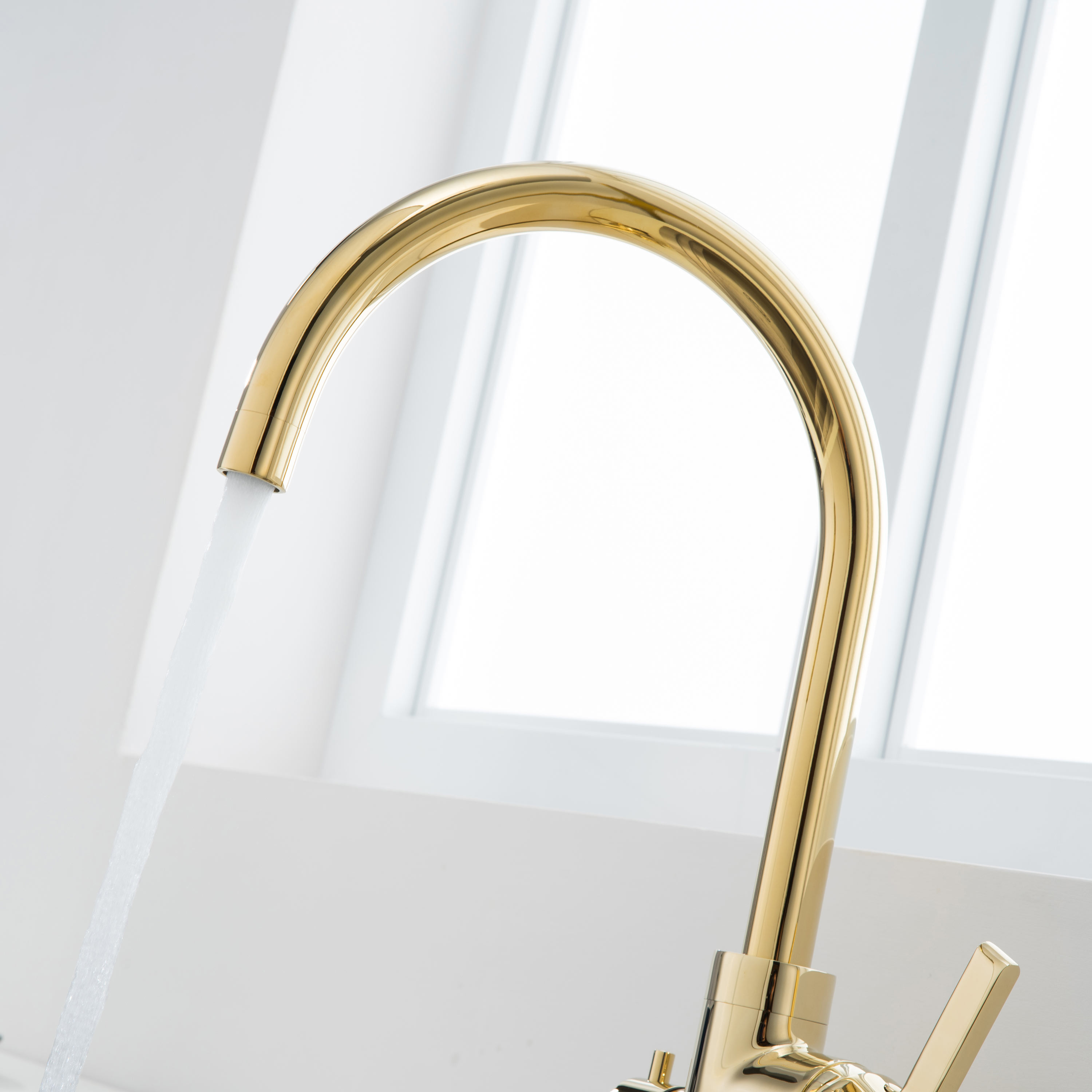 Pesukoneventtiilillä varustettu korkea keittiöhana Bathlife Ocean on ylellinen, kullan värinen hana, jossa on kääntyvä, C-mallinen juoksuputki. Tyylikäs hana sopii erinomaisesti moderniin keittiöön, jossa hanan kultainen pinta on elegantti yksityiskohta. Hanan pinta on helppo pitää puhtaana vedellä ja saippualla, ja asennusta helpottavat joustavat asennusputket.