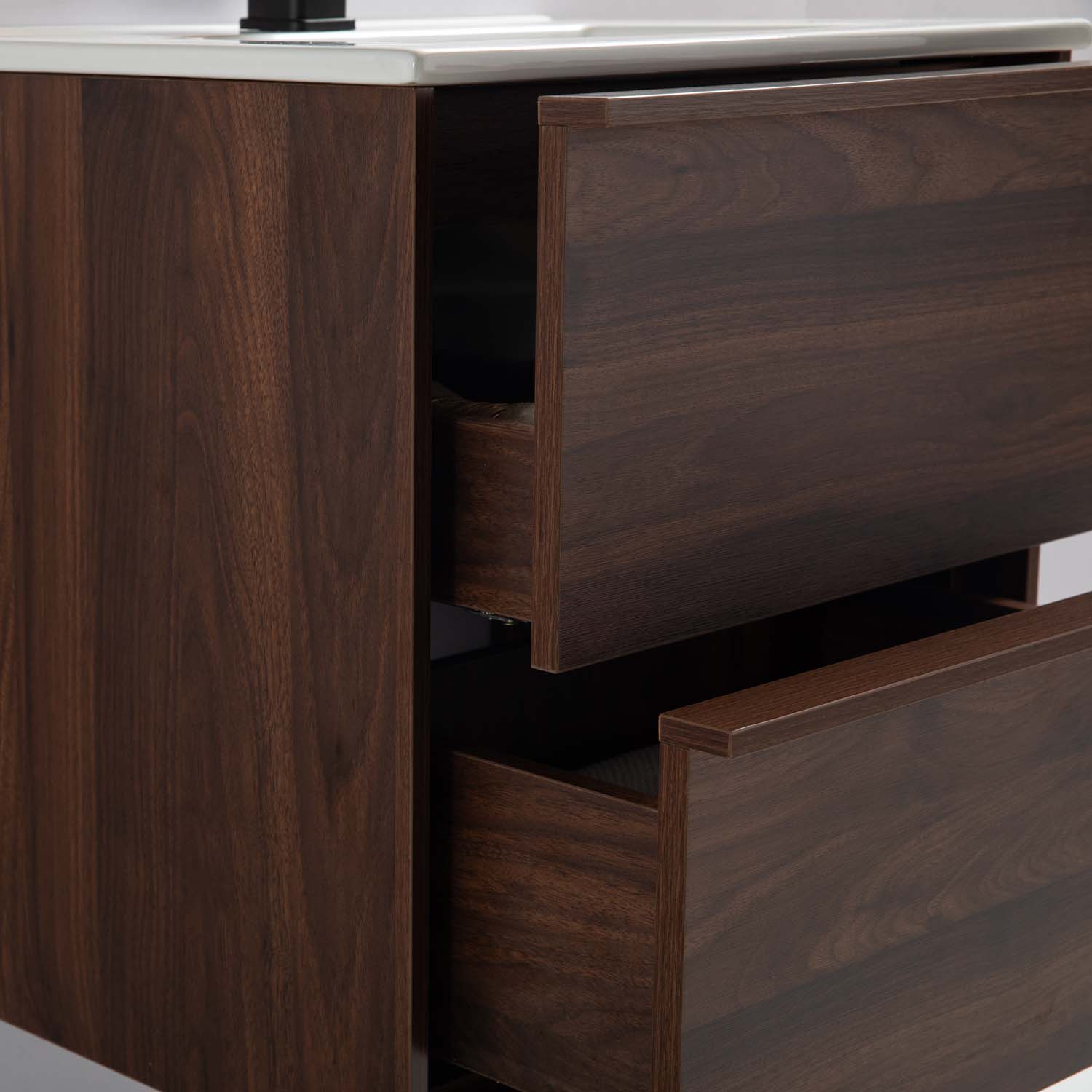 Kylpyhuonekaluste Bathlife Charm on moderni ja tyylikäs kaluste kauniilla puupinnalla. Pehmeästi sulkeutuvien laatikoiden etulevyissä on ohut raamikehys ja integroidut vetimet. Kaksi laatikkoa tarjoaa reilusti säilytystilaa. Kaluste on valmistettu melamiinipäällysteisestä MDF:stä ja toimitetaan koottuna. Kalusteen mukana tulee valkoinen posliininen pesuallas. Osta lisäksi pohjaventtiili, pesuallashana ja vesilukko. Bathlife on kehittänyt tämän tuotteen Ruotsissa tavoitteenaan tarjota edullinen ja laadukas tuote, johon voit luottaa ja josta voit nauttia pitkään.