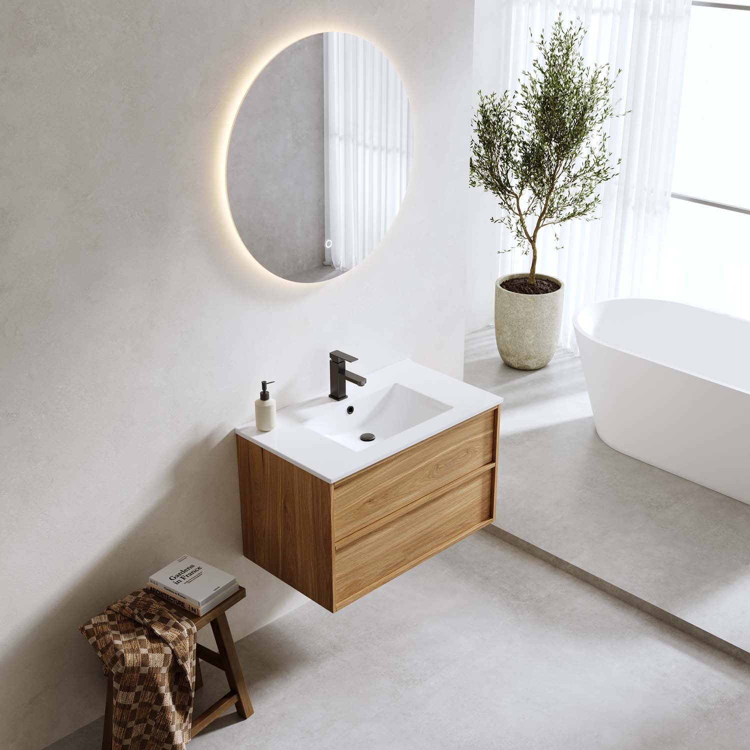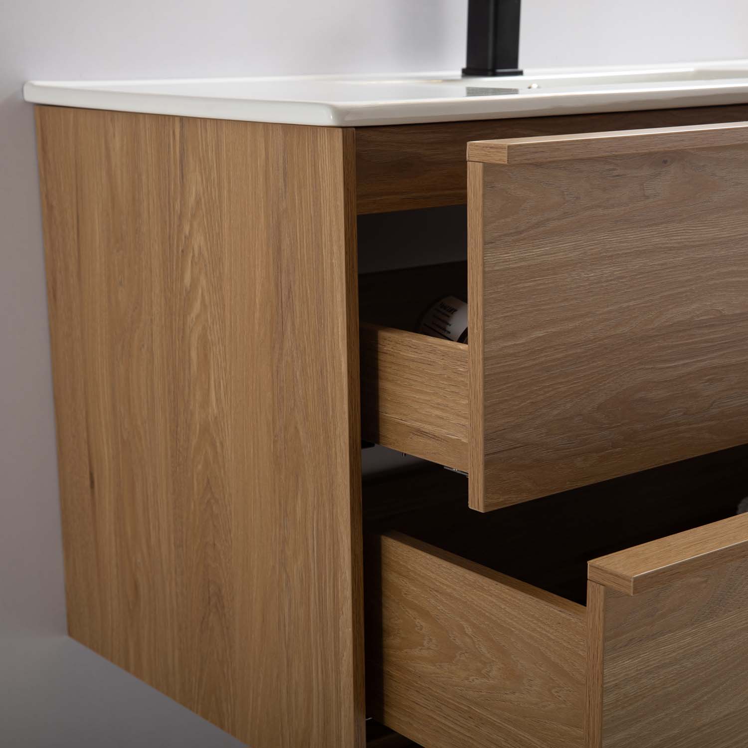 Kylpyhuonekaluste Bathlife Charm on moderni ja tyylikäs kaluste kauniilla puupinnalla. Pehmeästi sulkeutuvien laatikoiden etulevyissä on ohut raamikehys ja integroidut vetimet. Kaksi laatikkoa tarjoaa reilusti säilytystilaa. Kaluste on valmistettu melamiinipäällysteisestä MDF:stä ja toimitetaan koottuna. Kalusteen mukana tulee valkoinen posliininen pesuallas. Osta lisäksi pohjaventtiili, pesuallashana ja vesilukko. Bathlife on kehittänyt tämän tuotteen Ruotsissa tavoitteenaan tarjota edullinen ja laadukas tuote, johon voit luottaa ja josta voit nauttia pitkään.