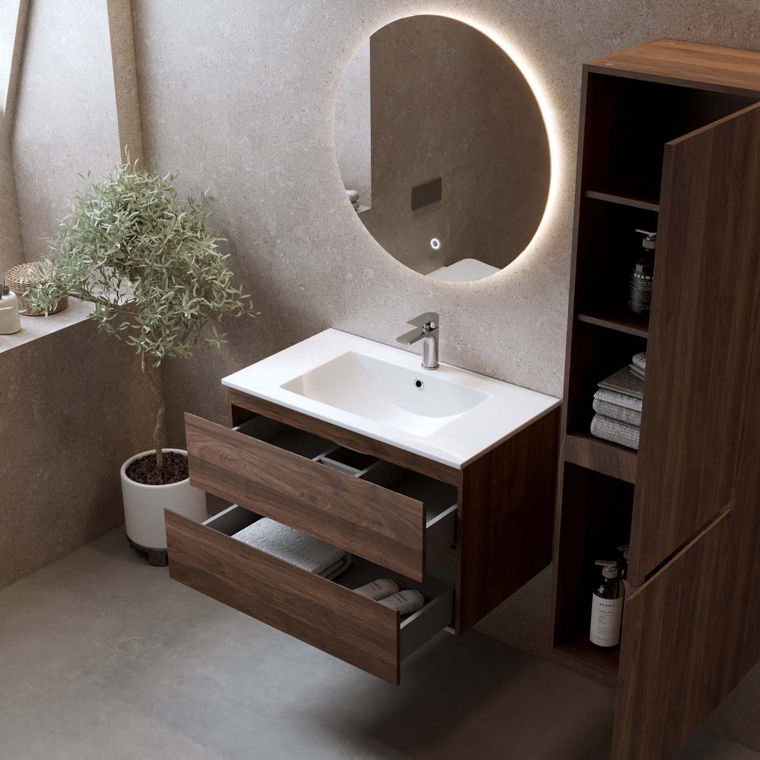 Bathlife Eufori pähkinä on tyylikäs allaskaappi pesualtaalla, joka antaa luonnollisen ja lämpimän tunteen puukuvioidulla pinnallaan. Valmistettu MDF-levystä. Pesuallas on valkoista posliinia. Kaappi tarjoaa tyylikästä ja fiksua säilytystilaa kahdessa laatikossa (4 laatikkoa leveydellä 1200 mm), jotka ovat pehmeästi sulkeutuvia.