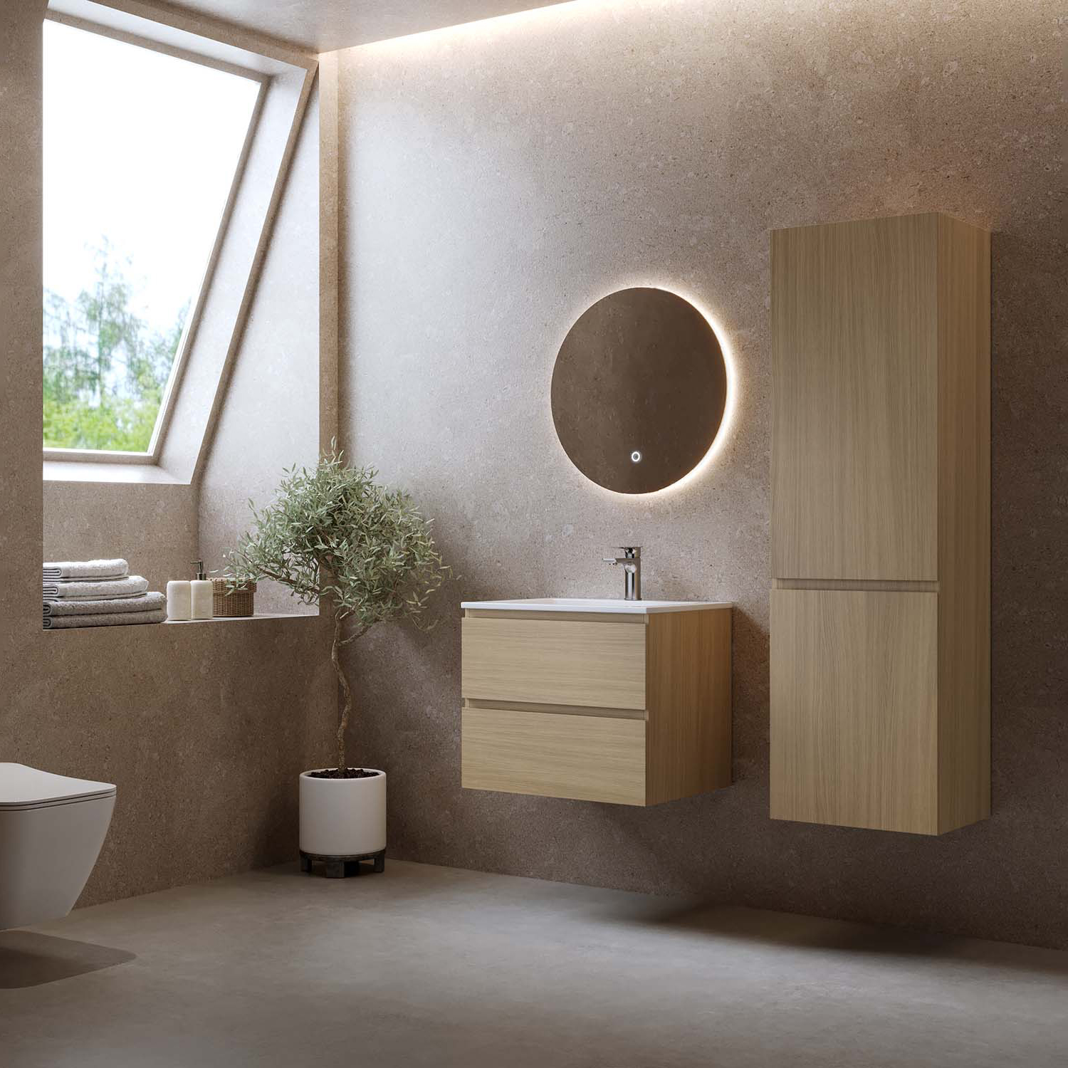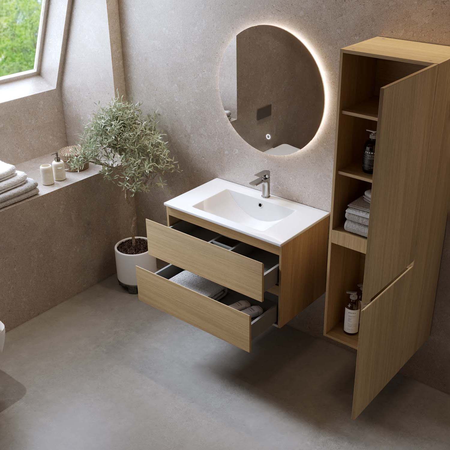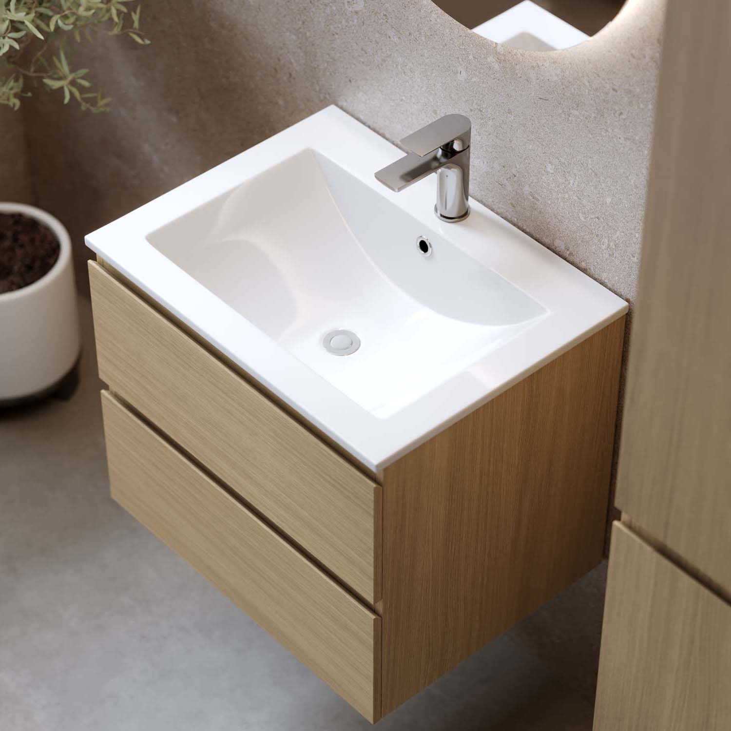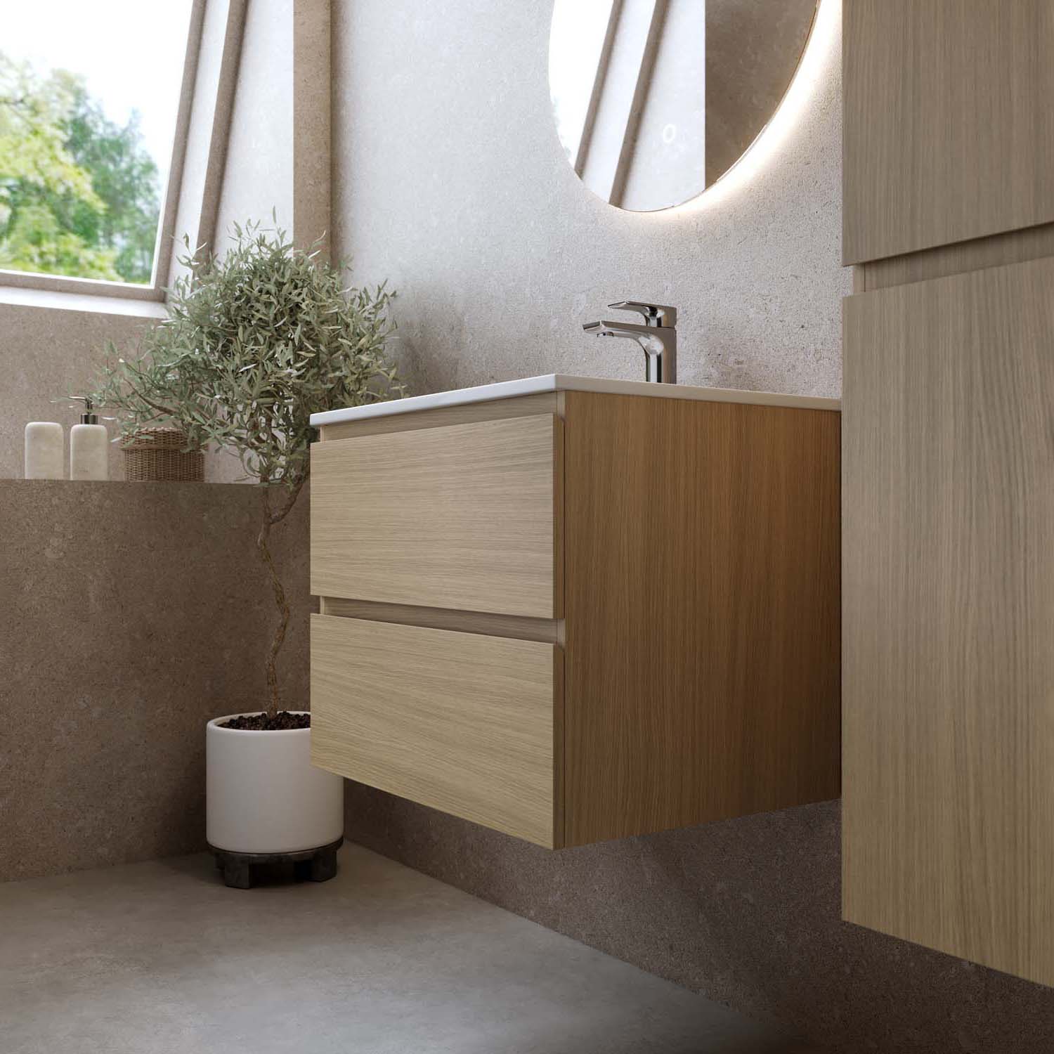 Bathlife Eufori vaalea tammi on tyylikäs allaskaappi pesualtaalla, joka antaa puukuvioidulla pinnallaan luonnollisen ja lämpimän tunteen. Valmistettu melamiinipinnoitetusta MDF-levystä. Pesuallas on valkoista posliinia. Kaappi tarjoaa tyylikästä ja fiksua säilytystilaa kahdessa laatikossa (4 laatikkoa, leveydellä 1200 mm), jotka ovat pehmeästi sulkeutuvia.