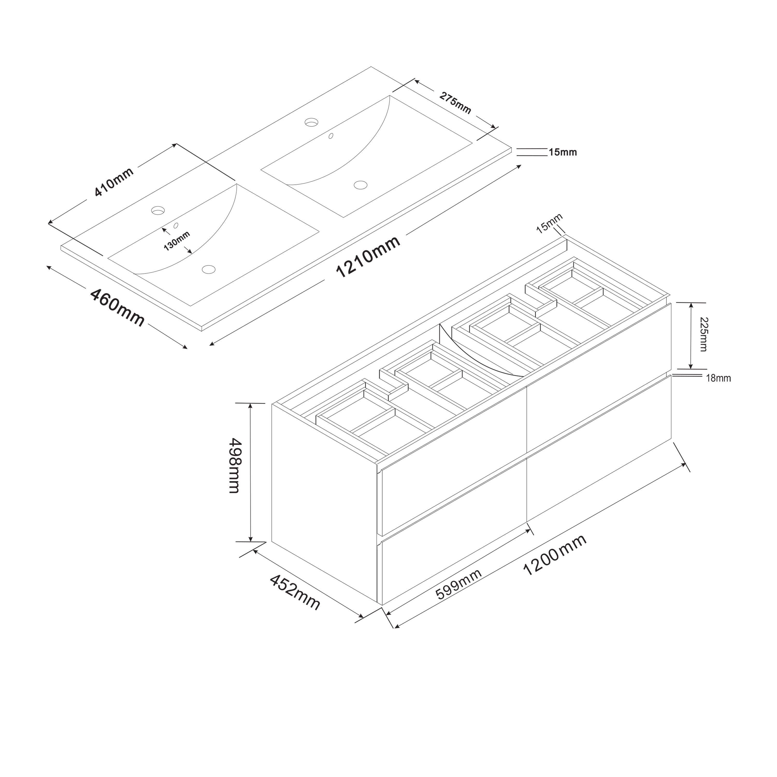 Toiminnallinen Bathlife Eufori 1200 -allaskaappi on loistava vaihtoehto, kun haluat päivittää kylpyhuoneesi nykyaikaan. Vetolaatikoiden etulevyt ovat yläreunoista viistot, joten vetimiä ei tarvita. Laatikot sulkeutuvat aina pehmeästi ja hiljaisesti. Moderni 1200 mm leveässä alakaapissa on paljon tilaa kylpyhuoneen erilaisille tarvikkeille. Kalustesettiin kuuluu valkoinen kaksoisallas, joka on posliinia. Kaksi pesuallasta helpottavat esimerkiksi lapsiperheen kiireistä arkea.