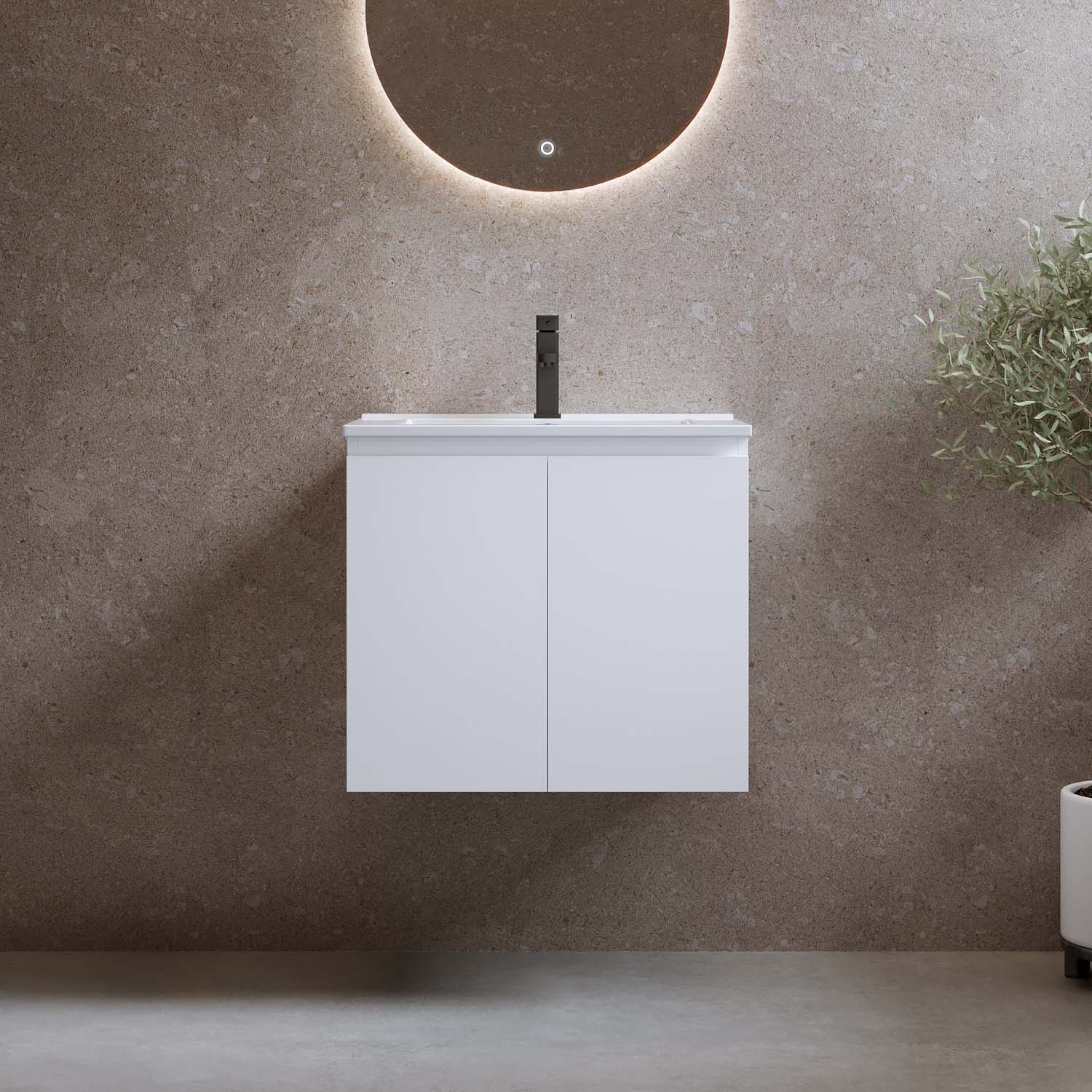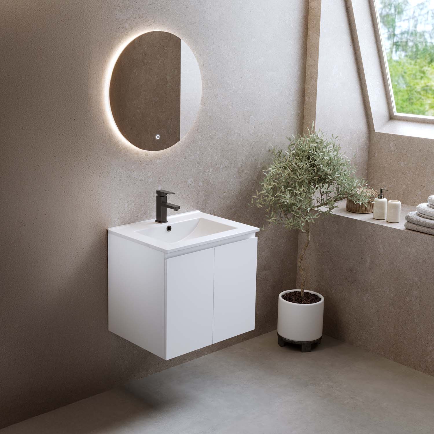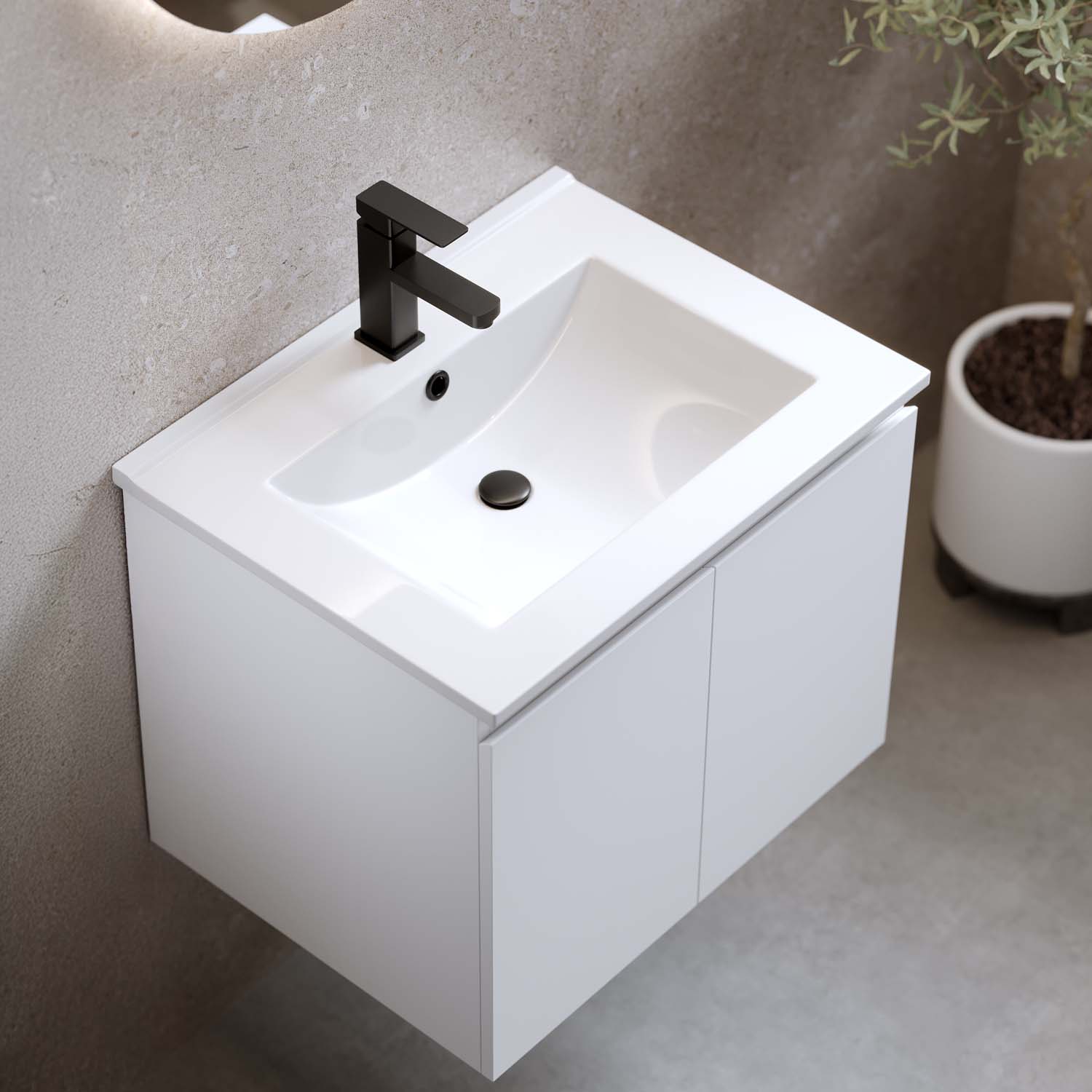 Kylpyhuonekaluste Bathlife Smila on tyylikäs ja edullinen pesuallaskaappi. Integroiduilla vetimillä varustetut kaksi ovea ovat pehmeästi sulkeutuvia. Kaapin sisällä on irrotettava hylly ja runsaasti säilytystilaa. Kaluste on valmistettu melamiinipäällysteisestä MDF:stä ja toimitetaan koottuna. Kalusteen mukana tulee valkoinen posliininen pesuallas. Osta lisäksi pohjaventtiili, pesuallashana ja vesilukko.